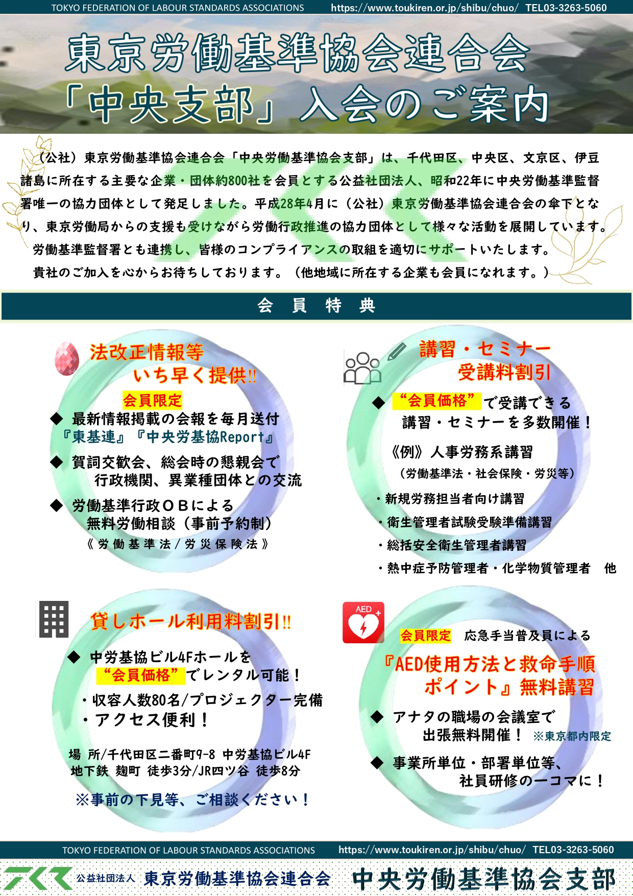 | 住所 | 〒102-0084 東京都千代田区二番町9番地8 中労基協ビル4階 TEL03(3263)5060 FAX03(3263)6485 https://www.toukiren.or.jp/shibu/chuo e-mail chuo-toiawase@toukiren.or.jp |